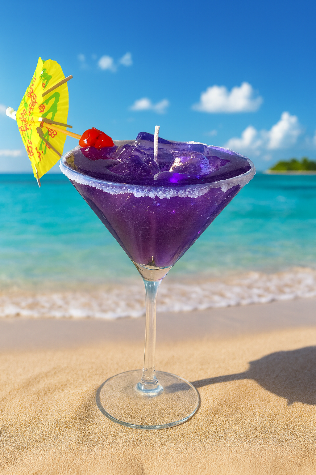 Suspended in crystal-clear gel wax, rich violet tones ripple like a storm rolling in at dusk. A sugared rim effect, and playful umbrella complete the illusion - a whimisical nod to summer nights, clinking glasses, and the first drop of rain on warm pavement.